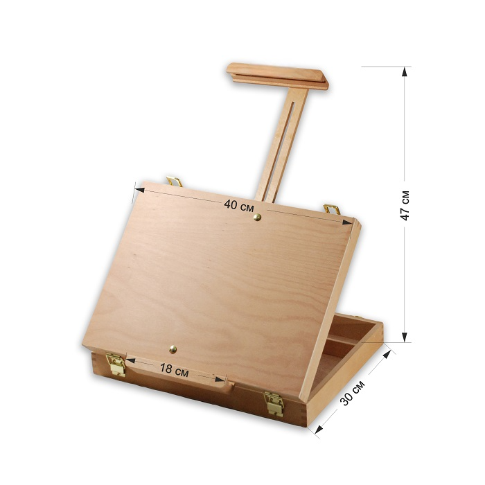 Удобный настольный этюдник сочетает в себе функции мольберта и ящика для хранения кистей и красок. За счет того, что регулируется как верхний бегунок, так и нижняя планка, этот этюдник легко удерживает холсты больших размеров. Выполнен из бука, покрыт лаком.