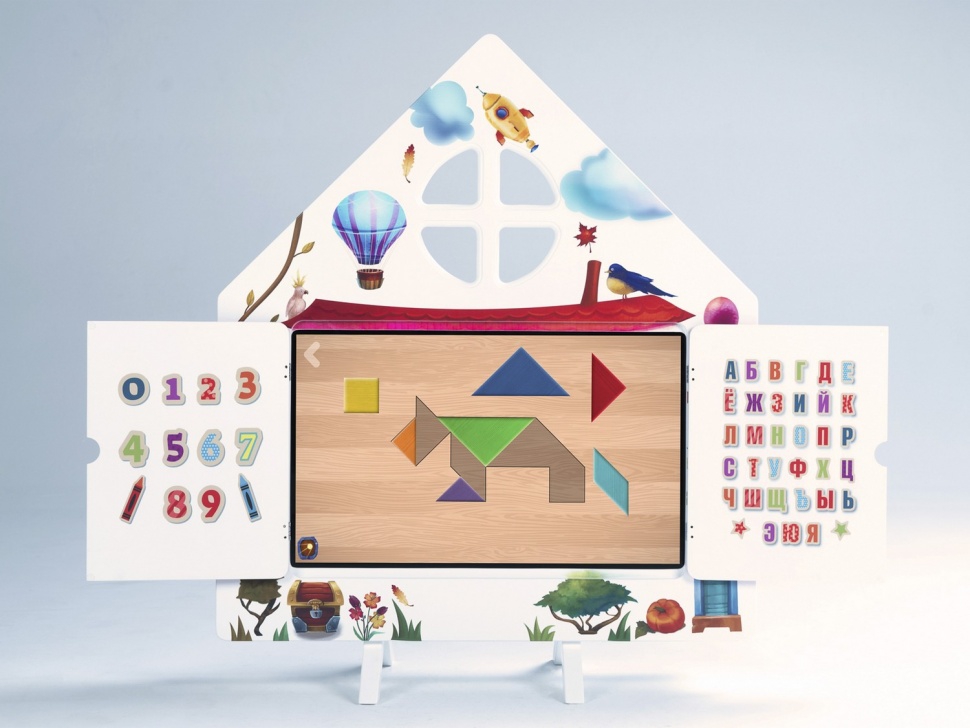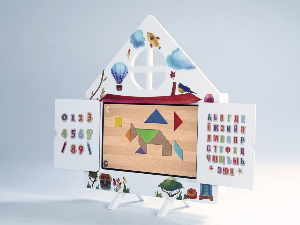 МИК «Теремок» - художественно оформленная интерактивная панель, имеющая створки, которые защищают от повреждений поверхность экрана. На створках располагается принт с алфавитом и цифрами.