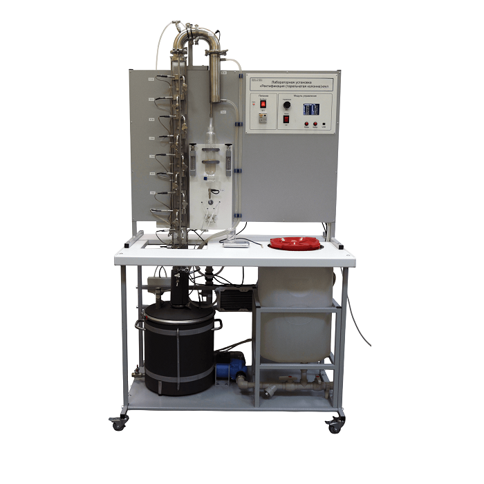 Установка позволяет проводить изучение фазовых переходов в сложных растворах при ректификации этилового спирта на тарельчатой колонне периодического действия.